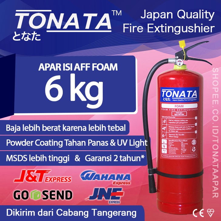 Ready Stock - TONATA ABC Powder APAR 6KG Set KomplitUkuran 6KG cocok untuk di ruangan sedang, dapur, dan kantor. Set komplit:1. Tabung APAR 6KG + FOAM 6KG + Nitrogen.2. Pressure gate3. Selang dalam4. Selang Luar5. Belt6. Leher tabung7. Fire Extingusher Holder (6KG)8. Safety tag9. Keterangan Refill10. Packing RapihIsi: FOAM. Cocok untuk api kelas A dan B. Kelas A merupakan api yang berada pada benda padat, seperti kayu, kertas, dan plastik. Kelas B merupakan cairan mudah terbakar seperti minyak tanah, dan bensin. FOAM aman untuk segala jenis barang padat, cairan, kecuali listrik. Foam dapat menyebabkan konsleting karena berwujud cair.MENGAPA BARANG APAR TONATA LEBIH BERAT: Dikarenakan lempengan baja kami lebih tebal mengakibatkan produk lebih berat. Isi powder, foam, dan CO2 juga sesuai dengan ukuran yang dibeli, karena kualitas TONATA nomor satu. Barang diproduksi langsung di Tangerang.GARANSI 2 TAHUN*1. Jika terjadi kerusakan / kebocoran pada produk dalam 2 minggu, kami akan mengganti produk yang baru. (TIDAK DIKENAKAN BIAYA APAPUN)2. Jika terjadi kerusakan pada tabung dalam 2 tahun, kami akan mengganti tabung baru. (DIKENAKAN BIAYA KIRIM SAJA)3. Prosedur DAMKAR Indonesia mengharuskan pergantian isi refill (CO2, Powder atau foam) 1 tahun sekaliNamun, jika kerusakan terjadi karena prilaku pembeli, kami tidak mempunyai kewajiban untuk mengganti pr