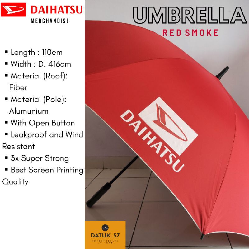 Item : Souvenir Payung Daihatsu GolfBahan : Fiber (Atap,) Alumunium (Kerangka)Harga : Rp. 95.000,-/ Pcs (Sudah termasuk secure pack)Panjang Payung : 110cmLebar Atap Payung : D. 416cmKeunggulan Payung :-Barangnya sangat awet untuk jangka panjang-Fiber tidak gampang bocor karena terdapat 2 lapis.-Bahan alumunium yang kokoh dan tidak mudah patah.-Walau terkena angin kencang dapat mudah dibetulkan-Lebih